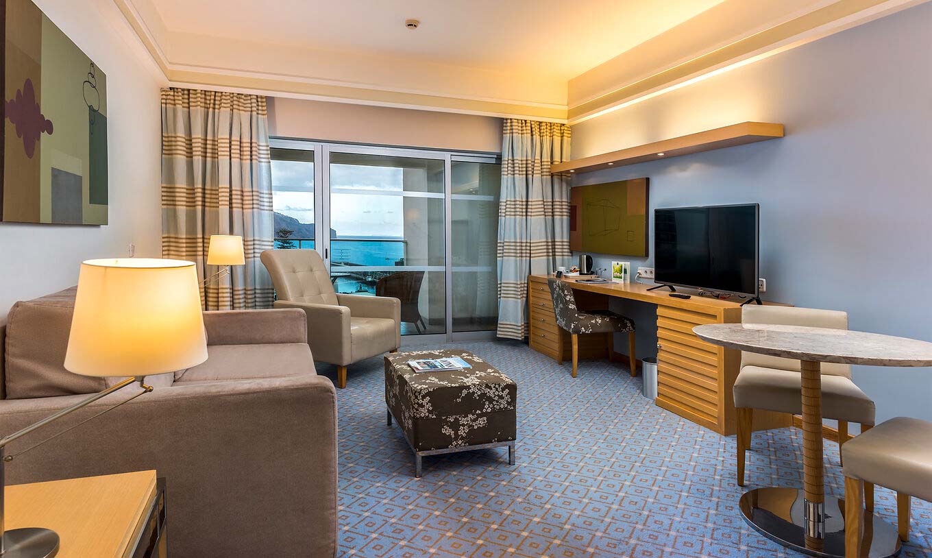 La habitación Doble Clásica Vista Mar Superior del Pestana Carlton Madeira tiene zona de estar con sofá, televisión y terraza