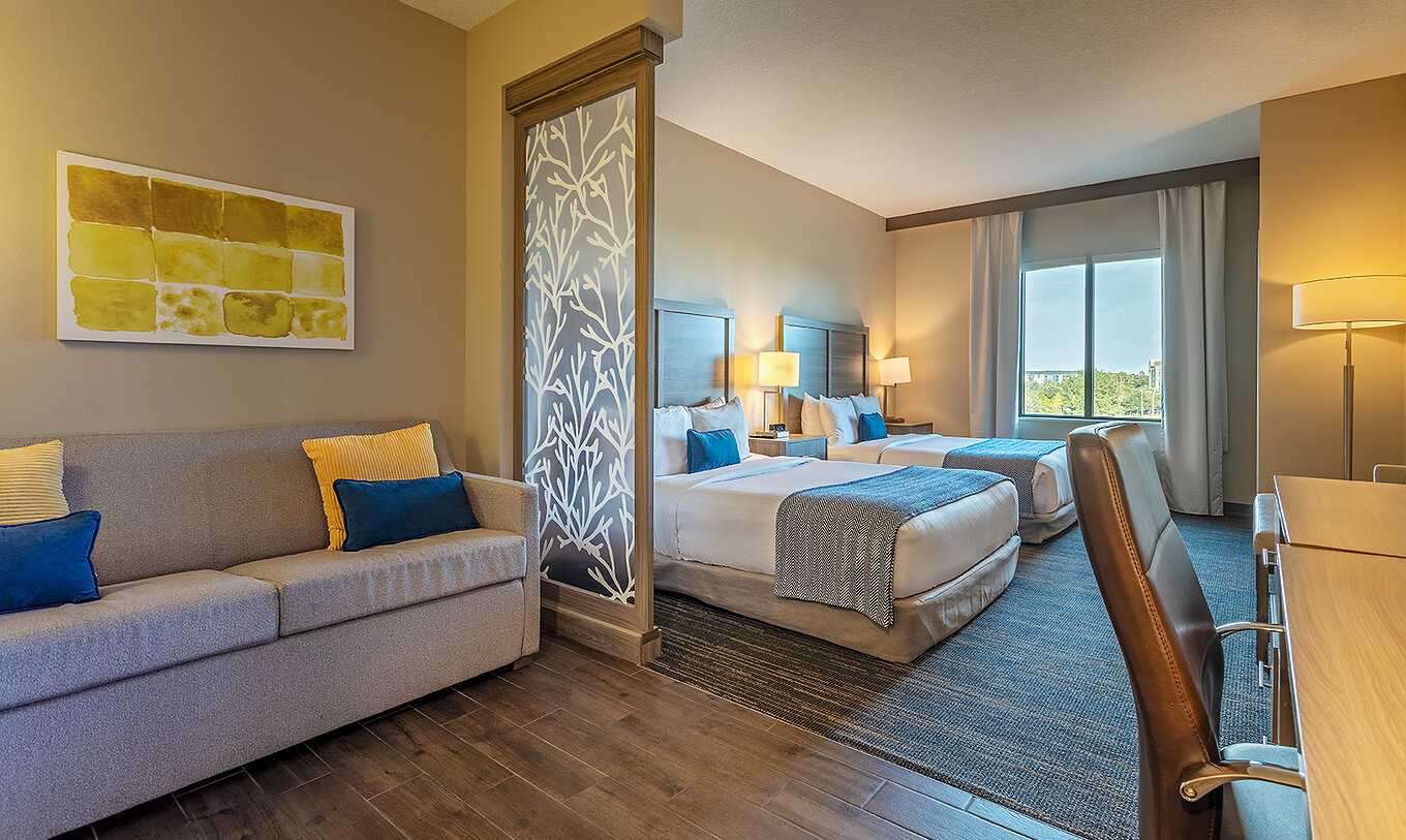 El Pestana Orlando Suites es la opción ideal para viajes en familia, con más de 100 amplias suites que, en algunos casos pueden alojar hasta 6 personas, así como para viajes de negocios, gracias a su ubicación privilegiada, cerca del Centro de convenciones, además del acceso a internet de alta velocidad, centro de negocios y estacionamiento privado.