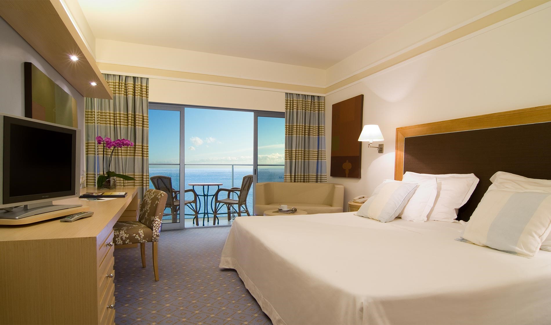 Quarto com varanda com mesa e cadeiras com vista sobre a baía do Funchal ou sobre o Mar. Dispõe de cama de casal ou 2 camas individuais, ar condicionado, televisão LCD, mini bar, possibilidade de fazer café e/ou chá (gratuito à chegada), cofre e wi-fii gratuito. O banheiro está equipada com secador de cabelo e banheira. Tem capacidade máxima de 2 adultos + 1 bebé de berço.