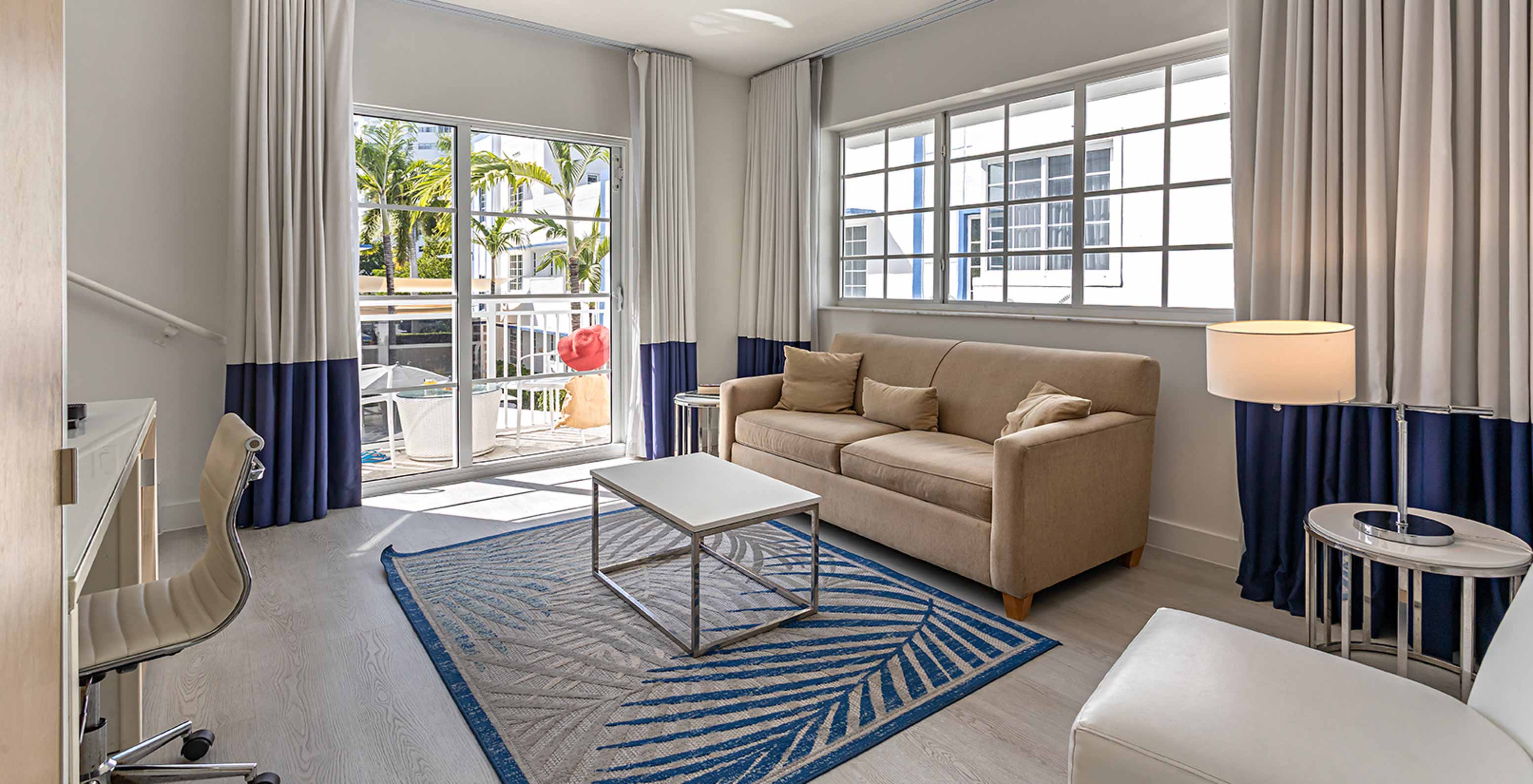 The Two Bedroom Suite with Balcony at Pestana Miami South Beach has a living room with sofa, chair, TV and a desk