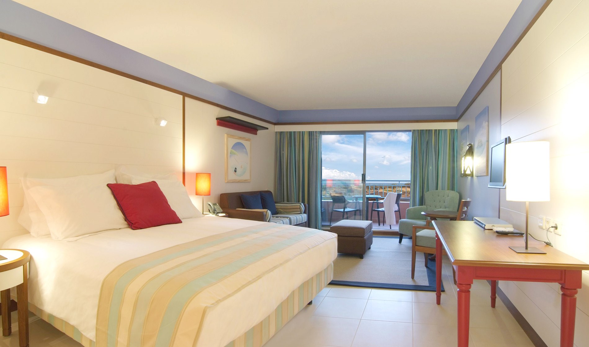 Com cama king ou duas camas individuais. Quarto com vista para o jardim ou para a piscina. Até 2 adultos e uma criança no berço. Para as famílias que necessitam de mais espaço, estão disponíveis quartos comunicantes (um duplo e um twin separados por uma porta de ligação). Inclui cofre digital e secador de cabelo.