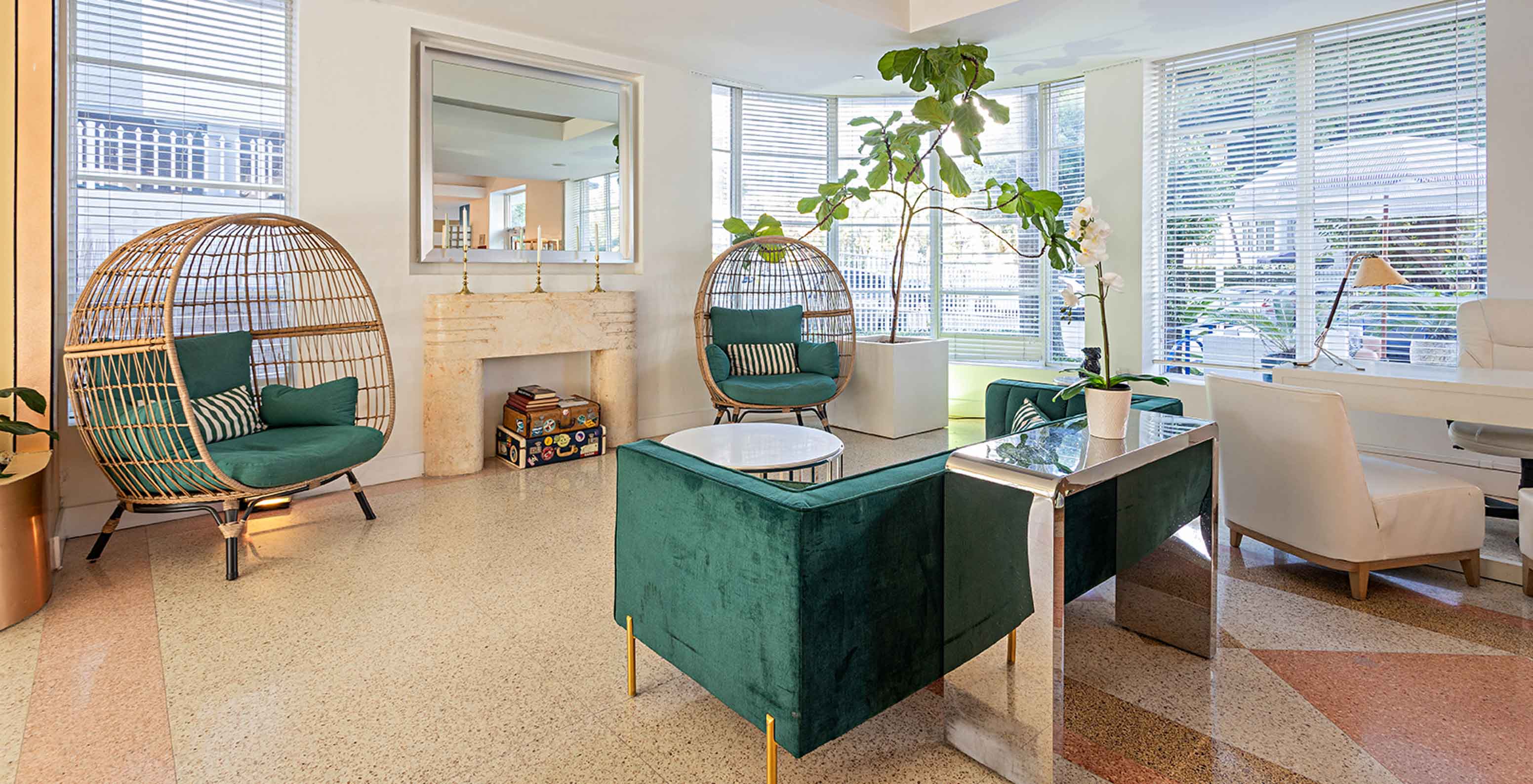 The Two Bedroom Suite with Balcony at Pestana Miami South Beach has a living room with sofa, chair, TV and a desk