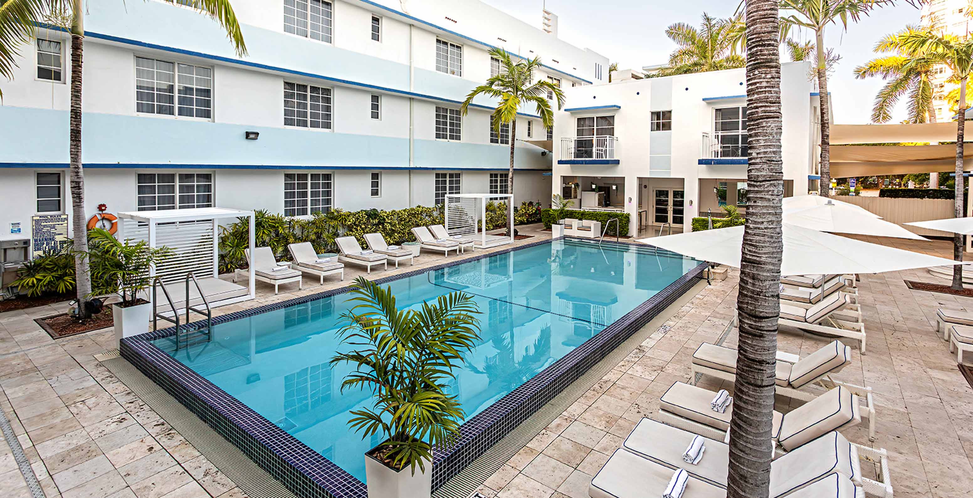 The Superior King Pool View at Pestana Miami South Beach is a modern pool with white loungers