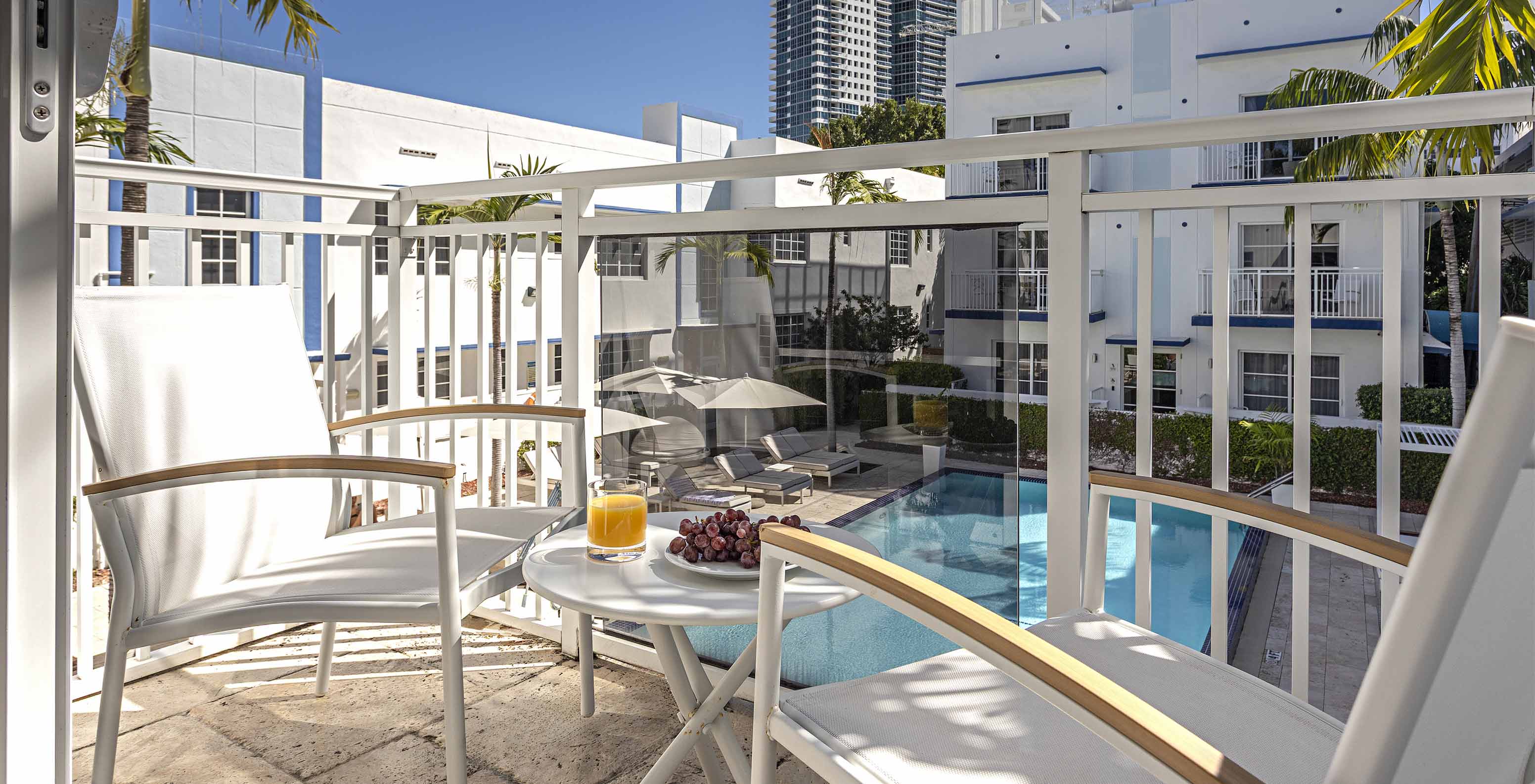 The Two Bedroom Suite with Balcony at Pestana Miami has a table and pool view.
